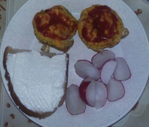 A tojásokat megkentem ketchuppal, egy fél rozskenyeret vajkrémmel és 2 db retek. Igen, a ketchup és a vajkrém nem a diétás kategóriába tartozik, de azt hiszem ennyi belefér. A rozskenyér pedig Ceres termék, ami egészen puha és könnyű. Az a bajom a rozskenyerekkel, hogy mind nagyon tömény, de ezt a fajtát apukámnak sikerült felfedeznie. Amúgy is ritkán eszek ilyesmi kenyeret, mert ugyanúgy kenyér, be kell vallani, még akkor is ha kevesebb búzaliszt van benne és több egészséges rost… inkább a puffasztott rizst szoktam választani kenyér helyett.