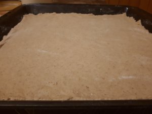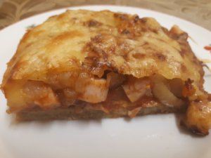 Ez a pizza most paradicsomos alappal (házi: hagyma, paradicsomlé, pizza fűszerkeverék, 1 kk cukor) készült. A feltét sonka, hagyma és sajt.